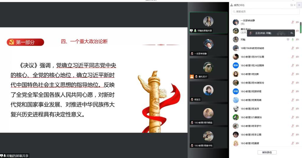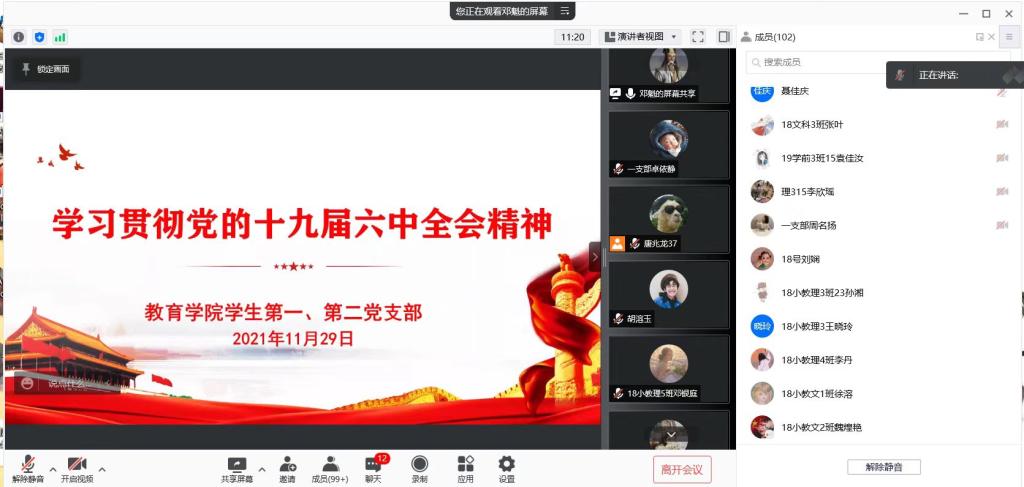 党的十九届六中全会是历史关头召开的一次具有重大历史意义的会议。会议于2021年11月8日至11日在北京召开。为深入学习贯彻会议精神,11月29日晚,伟德betvlctor1949源于英国学生第一党支部书记邓魁给伟德betvlctor1949源于英国学生第一、第二党支部全体党员同志及发展对象上党课,带领大家共同学习全会审议通过的《中共中央关于党的百年奋斗重大成就和历史经验的决议》。党课以线上的形式在腾讯会议上举行。
