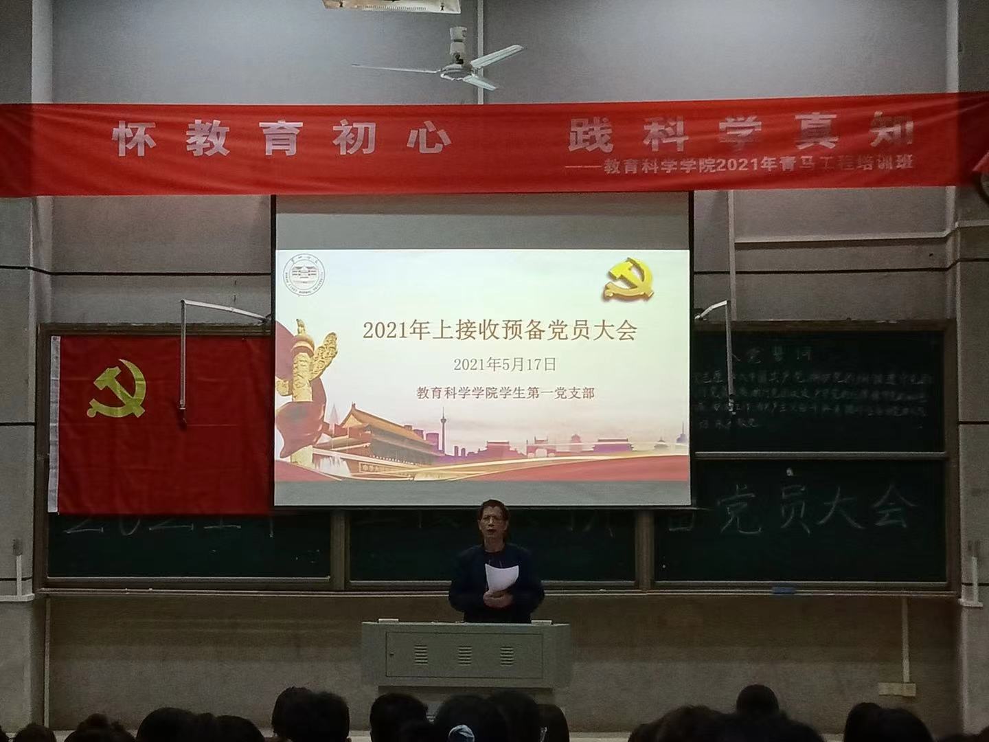 5月17日下午,教育科学学院学生第一党支部在怀中南110顺利召开预备党员接收大会,此次会议为表决邓张庆等39名发展对象转预备党员的问题。出席本次大会的老师有党总支副书记张志新同志、学工办主任刘军同志、培养人邓魁同志、孙三元同志、杨翼丞同志、学生第一党支部书记董晓娅老师以及支部的24位正式党员和79名预备党员。会议由支部组织委员郭清泉同志主持。大会开始前,刘军同志联系自身实际和切身感受发表讲话,鼓励在座同志多参加科研活动,积极与自己的入党介绍人谈话交流,不断提升自我,并对各位学生表达了真诚的祝福。