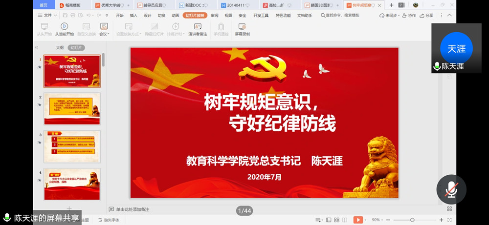 7月16日下午,院党总支书记陈天涯同志在腾讯会议平台上以“树牢规矩意识,守好纪律防线”为题为我院全体师生党员上了一堂精彩的专题党课。