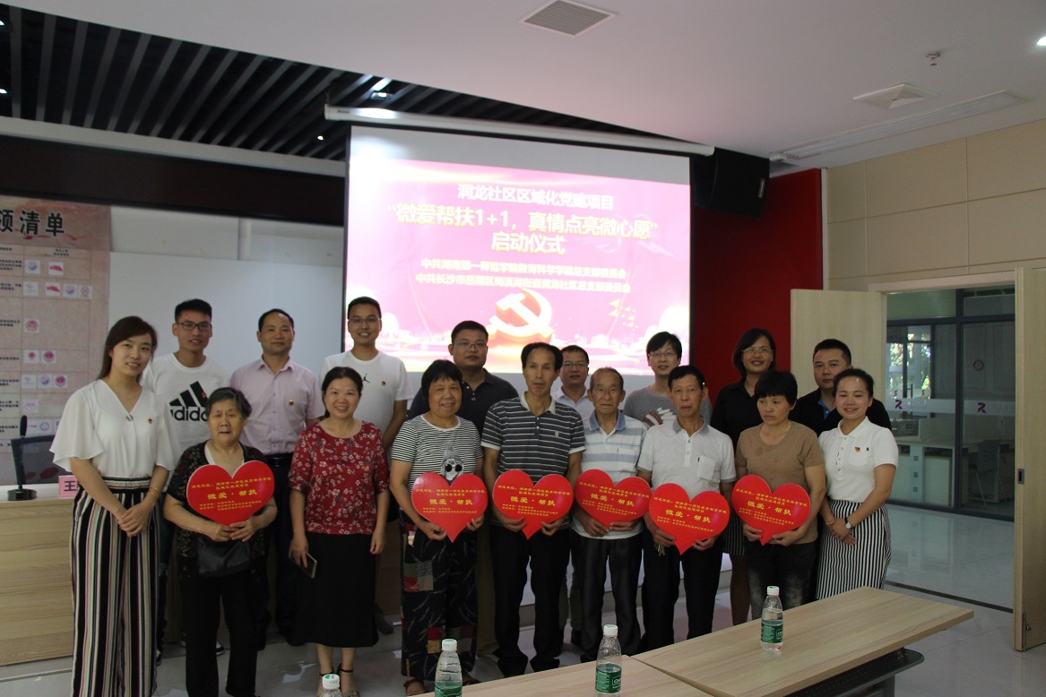 2019年6月25日下午,学院党总支推出的又一个共建项目:“微爱帮扶1+1,真情点亮微心愿”的启动仪式在岳麓区润龙社区党建中心成功启动。学院党总支委员、全体教师党员、润龙社区党总支委员、居民代表等一百余人参加。活动由梅溪湖街道润龙社区党总支委员黄茜同志主持。