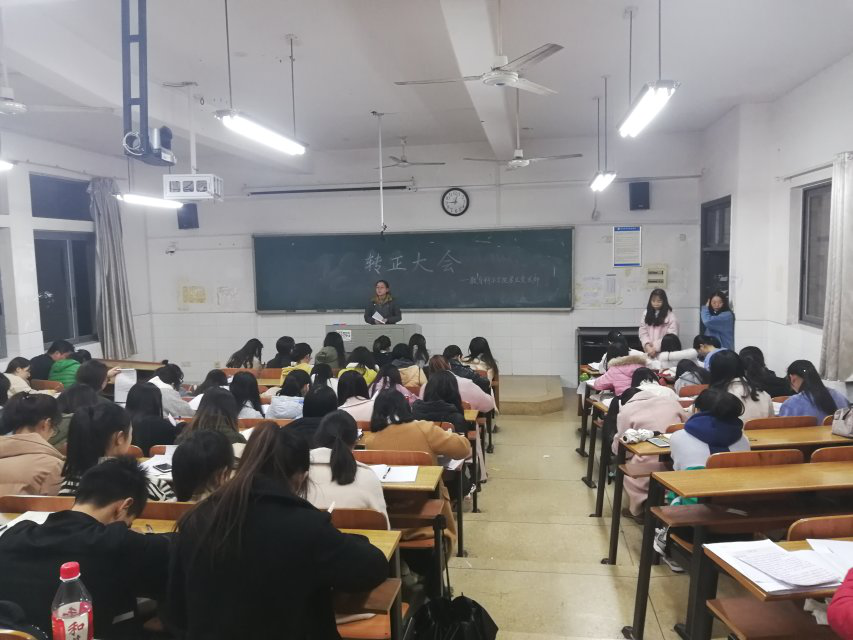 2018年11月12日晚上,教育科学学院学生党支部于怀中楼南栋205顺利召开了预备党员转正大会,讨论关于支部同志的党员转正问题。出席本次大会的有学工办刘军老师、支部书记董晓娅老师、罗娱老师和廖弘宇老师以及支部的19名党员、28名预备党员、19名发展对象。大会由教科院学生第二党支部副书记孙佳丽同志主持。