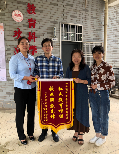 2018年9月25日上午,长沙梅溪湖街道润珑社区四点半乐学课堂学生家长代表给我校教育科学学院党总支送来了感谢锦旗。锦旗上写着“红色教育楷模,授业解惑先锋”,表达了润珑社区群众院党总支开展的支部共建“先锋工程”活动的感谢。学院党总支陈天涯书记、主持行政工作的胡春光院长代表学院接受了锦旗,并就进一步扩大共建活动进行了探讨