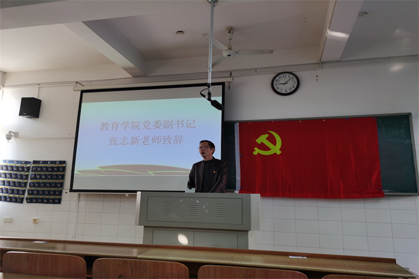 大会在庄严的奏唱国歌声中拉开帷幕,张志新副书记代表学院党委致辞。张书记首先向即将加入党组织的38名同志表示祝贺,指出从今天开始,大家除了自然生日外,还有一个政治生日,要珍惜自己的政治身份。其次,要承担责任,加入中国共产党不是享受,而是要发挥先锋模范带头作用,要有服务意识和奉献精神。最后,要加强政治理论的学习,做到又红又专,提高本领,更好地服务社会。