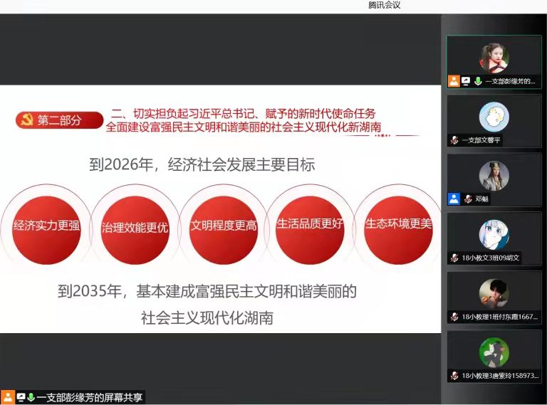 大会的开始,主持人向各位党员同志介绍了湖南省常委班子的组成,让支部党员同志们对新一届常委班子人员构成有所了解。随后,党员同志们共同学习了湖南省第十二次党代会的九大核心内容。湖南省第十二次党代会指出要切实担负起习近平总书记对湖南赋予的时代使命担当,从多个角度制定了到2026年实现“经济实力更强、治理效能更优、文明程度更高、生活品质更好、生态环境更美”的经济社会发展主要目标。