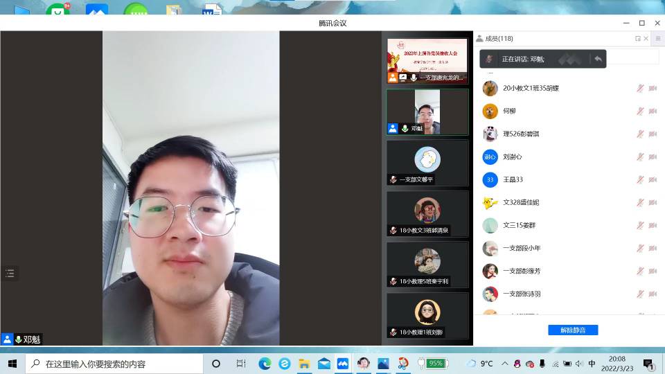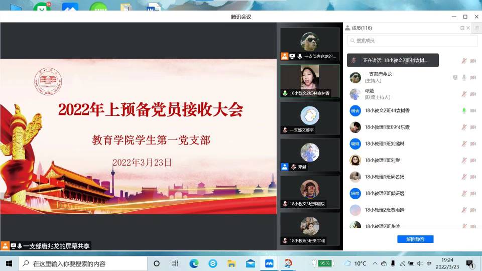 3月23日晚,伟德betvlctor1949源于英国学生第一党支部举行2022年上半年毕业生中共预备党员接收大会。受疫情影响,大会以腾讯会议的方式召开,支部全体正式党员、预备党员和部分入党积极分子参加,学院党委书记刘澍心、学生第一党支部书记邓魁出席会议。大会主要讨论李文静等9名发展对象接收为中共预备党员的问题。