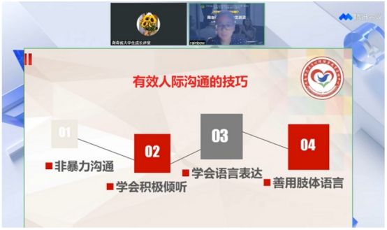 2025年5月22-24日晚,由湖南省高校思想政治教育研究会学生心理健康教育专业委员会、湖南省高校学生心理健康教育创新中心联合主办的“湖南省大学生成长讲堂第十一讲”通过腾讯会议线上开讲。本次讲座主题为“用心沟通 搭建心灵桥梁——大学生人际沟通技巧漫谈”,由陈虹教授主讲,课程从倾听的艺术、表达的方法、非语言沟通的作用等多个维度,系统地阐述了人际沟通的核心要点和实用技巧,并强调了良好的人际沟通在大学生活及未来发展中的重要性。吸引了省内各高校师生广泛参与,为湖南省第十八届“5·25”大学生心理健康日主题教育活动增添了浓墨重彩的一笔。