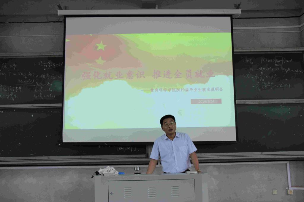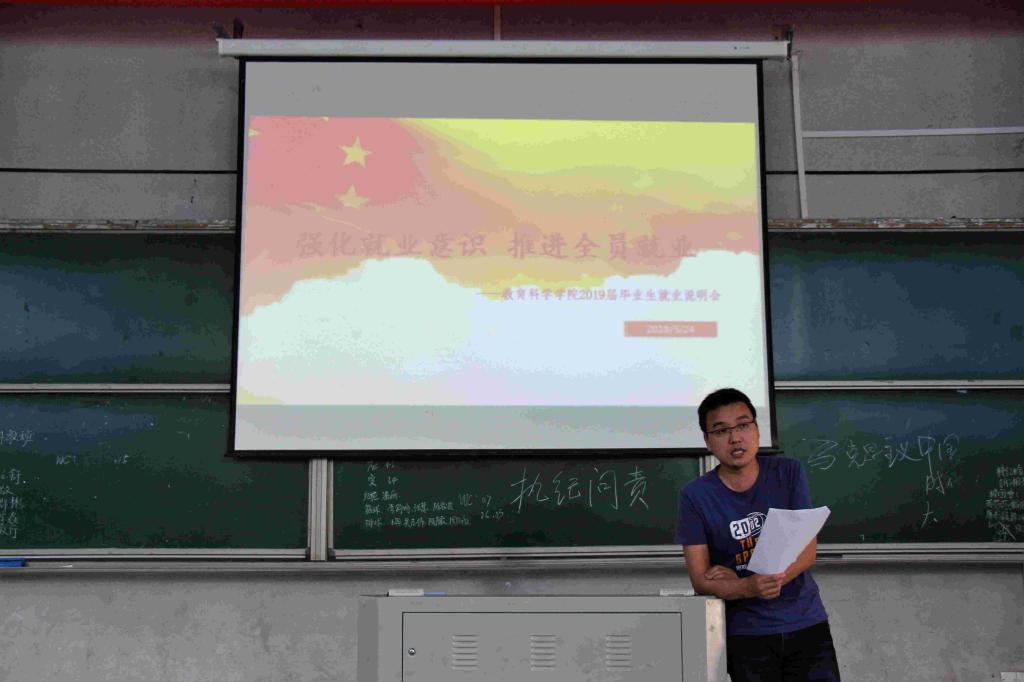 5月24日下午,教育科学学院2019届毕业生就业说明会分别在怀中楼南栋107、109及110教室召开。会议分别由我院党总支副书记张俭明、学工办主任刘军及团总支书记罗娱主讲。毕业班辅导员及2019届全体毕业生到场参加会议。