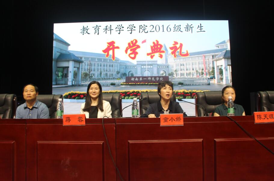 2016年9月11日上午,教育科学学院2016级新生开学典礼暨入学教育在音乐楼大剧场隆重举行。童小娇校长应邀出席,教育科学学院负责人蒋蓉、陈天涯、王建平、刘丽群、全体辅导员老师及820余名新生参加了典礼。典礼由院党总支副书记张俭明主持。