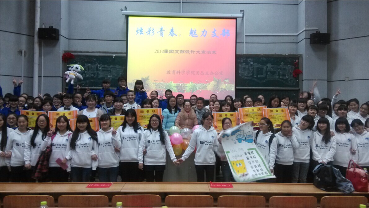 2014年12月29日晚19点,由教育科学学院团总支主办的“炫彩青春,魅力支部”主题系列活动之“2014级团支部形象设计大赛”在东方红校区文科楼报告厅顺利开展。教育科学学院谭玉兰副书记、学工办主任陶青老师,专职辅导员罗娱、石慧、杨杨应邀观看了比赛。