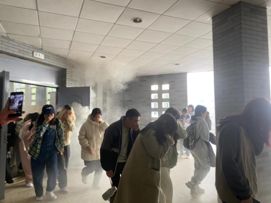 在讲座的最后,周洋教官组织同学们进行了火灾疏散演练,告诉同学们按照疏散路线逃生,同时强调了演练过程中的注意事项,使同学们能够熟悉掌握并灵活运用逃生知识。演练过程中,同学们在教官和老师们的指引下,捂住口鼻,弯腰前进,用最快的速度,有序地撤离了现场,到达指定地点集合,达到了消防演练的预期效果。
