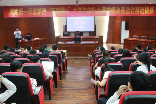 7月8日下午,我校“互联网+”大学生创业大赛校级决赛暨省赛选拔赛在东方红校区特立楼模拟法庭成功举办。担任本次大赛的评委有湖南“你最红”策划有限责任公司总策划贺焱,洽味蜂蜜、简职鸟创始人刘松博士,伟德国际1949商学院学工办主任禹晗。招生就业处处长周大庆出席本次大赛,大赛由商学院创业老师张鹏主持。