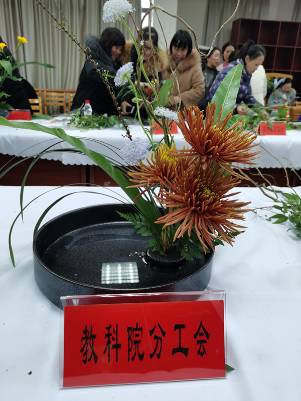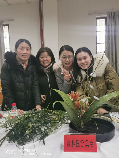 由张兰兰、黄任之、杨杨、孙三元老师组成的我院分工会代表队,凭借自己对美的不同理解,经过精心修剪、巧妙搭配、点缀等步骤,把原本普通的花草变成了独具匠心的花艺作品。