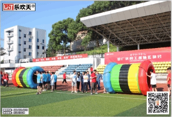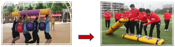 项目简介:每队派出8名队员,以接力的方式进行,4人以纵队站于起点双手举起圆柱,相邻的两人中间夹一个充气球(球只能放置于前胸和后背的位置),从起点出发通过指定的赛道,到达接力点与队员交接,接力4名队员使用两个充气筏完成指定的赛程,队员通过协作使用道具依次交替向前行进,在过程中队员不能接触地面;最后器材触线,以及所有队员过终点线计时结束,以用时多少排名;