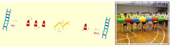 项目简介:每队出12名队员,以接力的方式进行,6名队员从起点出处双手抬起道具,待裁判吹哨后出发,6人通过协作往前行进通过指定的赛道(绕障碍、限宽门、转圈)完成30米赛程,到达接力点后换6名队员完成交接,然后队员再以同样的方式返回起点(转圈、限宽门、绕障碍),出发开始计时,完成计时结束,用时少的队伍排名靠前。