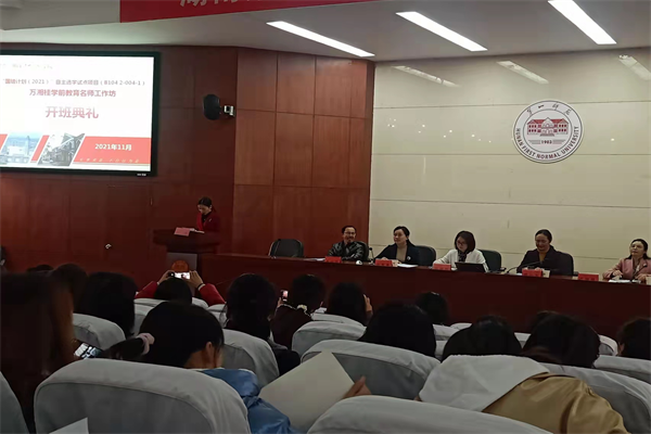 11月29日上午8:30,“国培计划(2021)”自主选学试点项目(B104-2-004-1)万湘桂学前教育名师工作坊在我校开班。伟德betvlctor1949源于英国院长刘丽群、湖南省教育科学研究院基础教育研究所副所长周丛笑、学前教育教研室主任万湘桂、岳麓区幼教集团第八幼儿园园长彭青青、学前教育教研室教授袁小平等出席开班典礼。开班仪式由工作坊班主任黎玲主持。