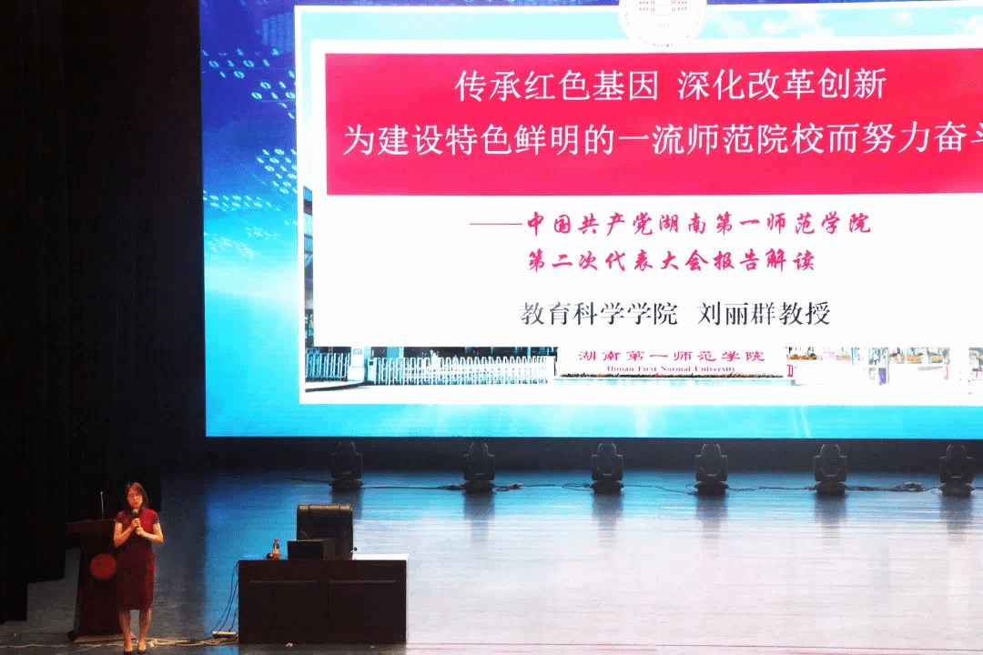 为落实我校立德树人的根本任务,向2021级新生贯彻中国共产党伟德国际1949第二次代表大会中学校发展战略和传达会议精神,以此提升我校学生素质,促进其全面发展,为建设特色鲜明的一流师范院校而努力。9月19日下午15:20,伟德国际1949教育科学学院在田汉大剧院举行了2021级新生入学教育(五)——以“传承红色基因,深化改革创新”为主题的学校第二届党代会报告精神解读讲座。我院党总支书记陈天涯、刘丽群教授、党总支副书记张志新、副院长曾晓洁、副院长黄月胜、副院长许兰、学工办主任刘军、团总支书记孙三元及辅导员老师们出席讲座。本次讲座由刘丽群教授主讲,我院副院长许兰主持。