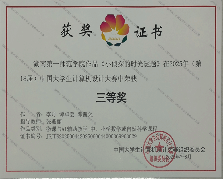 2025年7月22日至26日,第18届中国大学生计算机设计大赛南京南决赛区(数媒静态设计、微课与教学辅助)赛事收官,伟德betvlctor1949源于英国教育技术学专业学生凭借扎实的专业知识和出色的创新实践能力,共获得21个奖项,其中伟德betvlctor1949源于英国张燕丽老师指导的作品《小侦探的时光谜题》荣获全国三等奖,另有中南赛区一等奖3项、中南赛区二等奖4项、中南赛区三等奖13项。