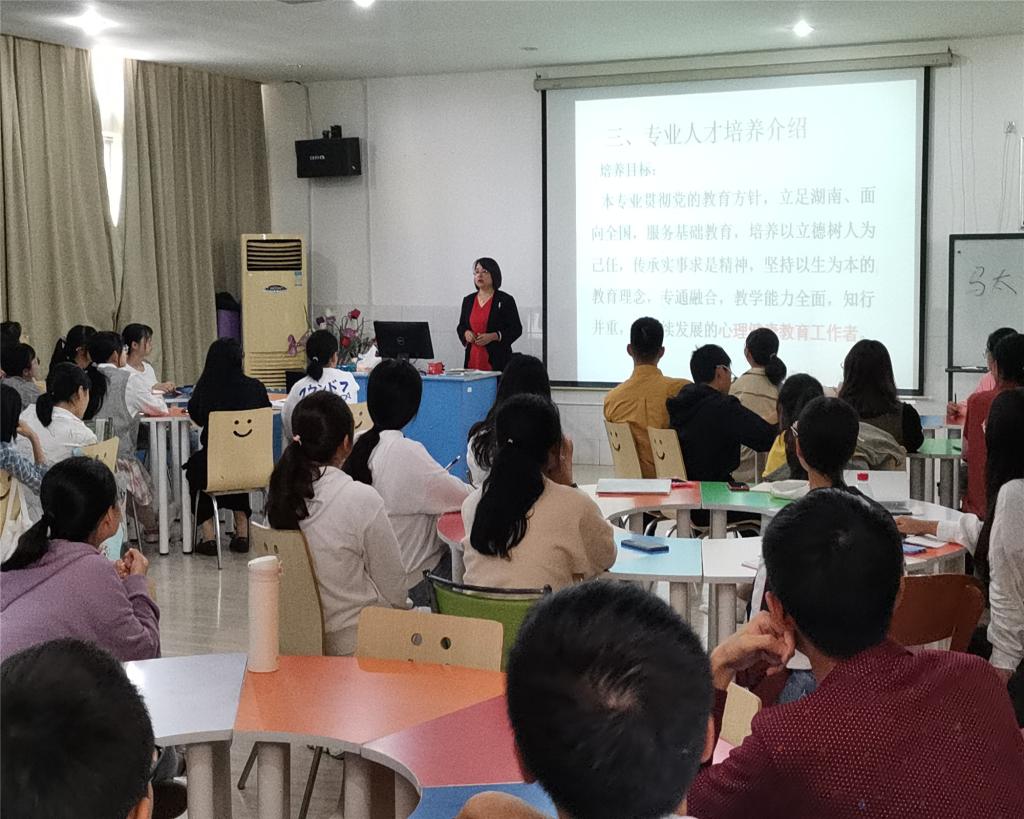屈晓兰博士先简要介绍了心理学专业的发展历史,着重介绍了近三年本专业的成就,包括2020年获批湖南省一流本科专业建设店,2019年获批“儿童心理发育与脑认知”湖南省重点实验室等。在介绍本专业教师在各自领域所取得的成就以及研究方向之后,屈晓兰博士向20级学生详尽介绍了专业人才培养方案,强调本专业培养的是“师德高尚、人格健全、尊重学生、以生为本、专通融合、以专为主、实事求是、知行合一、与时俱进、毕生发展”的心理健康教育工作者,并介绍了本专业近5年的就业情况,同时结合社会需求、政府工作报告等探讨了本专业的就业前景。最后,屈博士结合学校、院部的实际情况,对20级新生提出了本科阶段学习规划要求。同学们谈到,在了解了专业各种情况以及专业就业前景后,仿佛拨开了前方的迷雾,对本专业了解更深,未来的目标更明确了。且纷纷表示将努力学好专业知识和教师技能,不断充实自我。