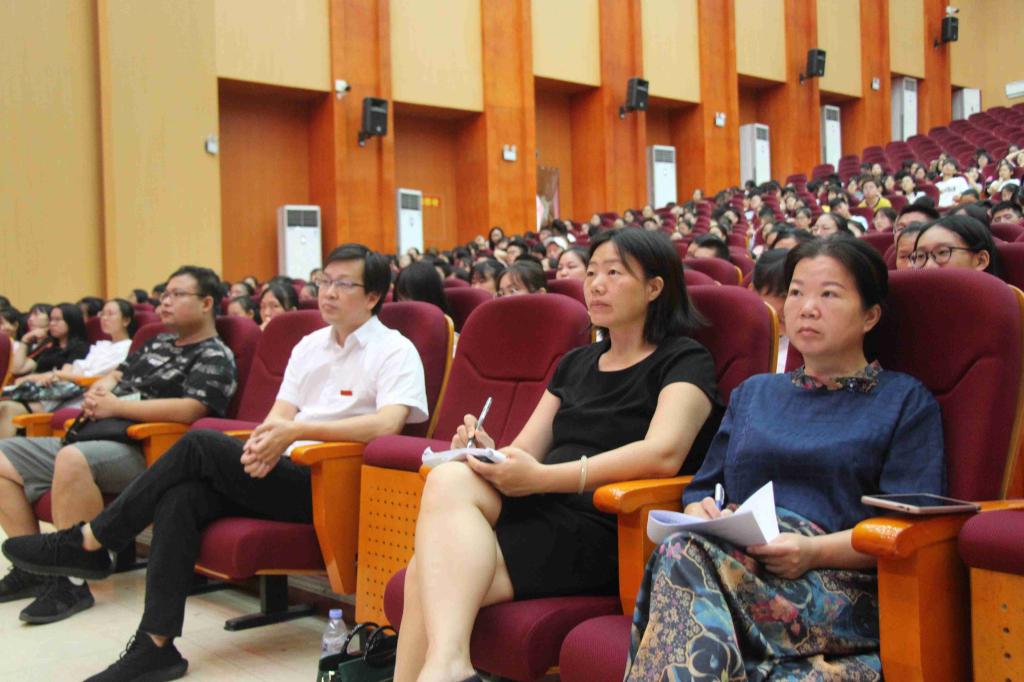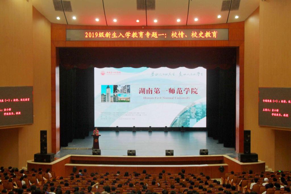 2019年9月8日上午,在学校田汉剧院,校长童小娇教授为教育科学学院2019级592名新生做了校情、校史教育专题讲座,上了入学教育第一课,教育科学学院党总支副书记、院长胡春光主持。