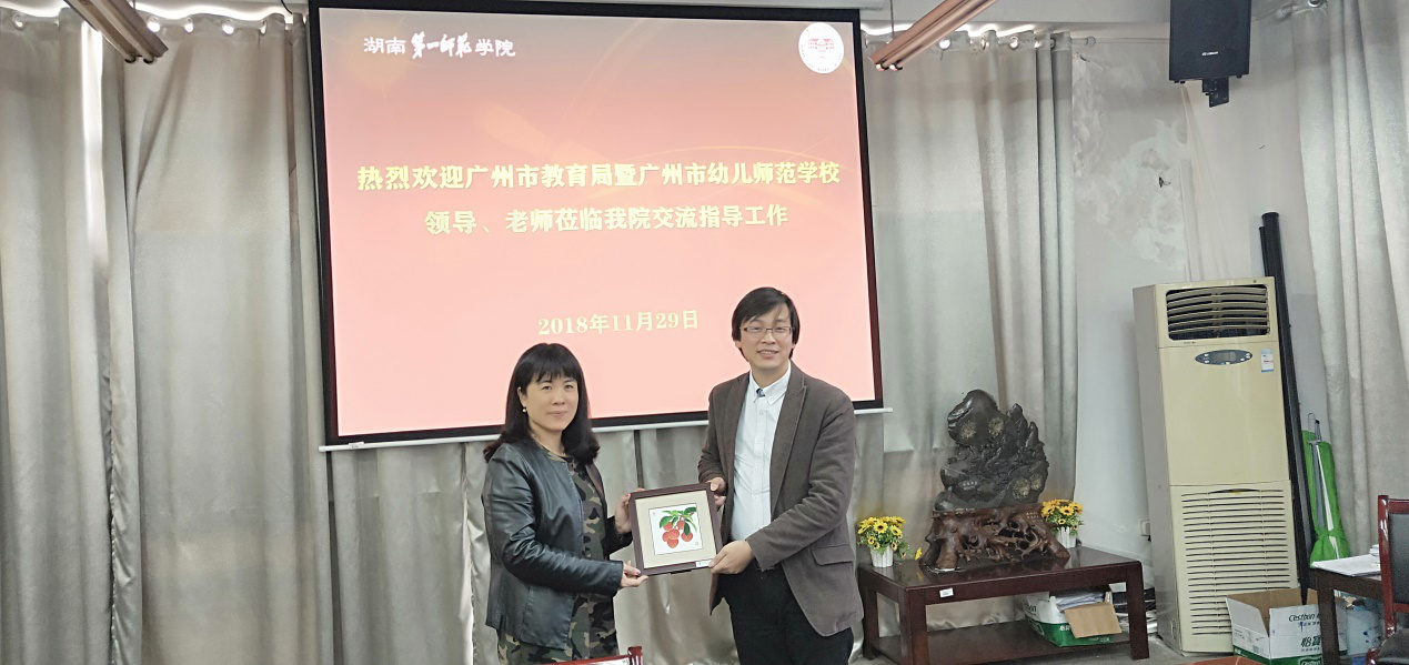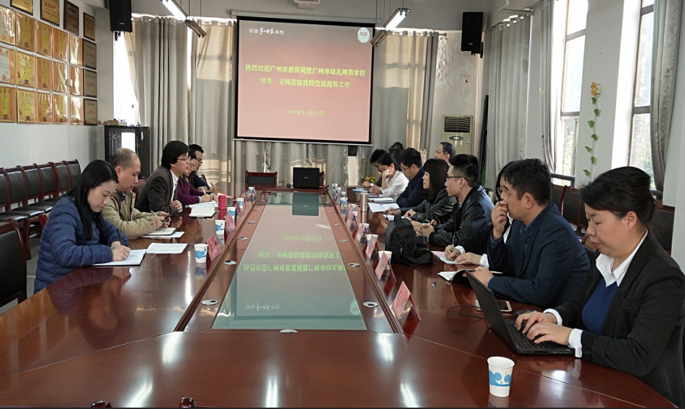 2018年11月29日下午,广州市教育局规划建设处郭文副处长、广州市幼儿师范学校丘毅清校长等一行10位教师来我院学习交流。我院胡春光副院长、学前教育教研室万湘桂主任、院党政办李令主任、院教科办汤勇主任以及院学工办刘军副主任在特立楼北栋208会议室热情地接待了来访人员。