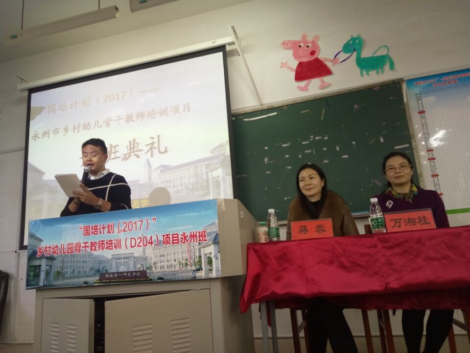 2017年11月22~30号,国培计划-湖南省乡村幼儿园骨干教师培训项目在我校举行。该项目培训的首席专家是学前教育教研室主任万湘桂副教授,学员是来自永州市各个区县的70名乡村幼儿园骨干教师。