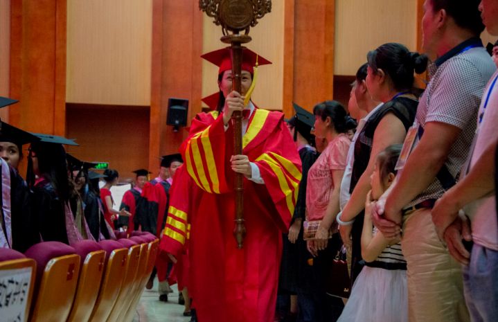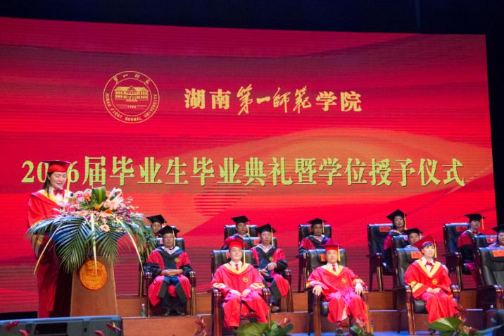 伴着伟德国际1949的校歌,在全场毕业生的热烈掌声和注目下,权杖教授蒋蓉手持象征崇高教育和圣洁知识的权杖,引领主礼教授队伍缓缓进场。仪式在雄壮的国歌声中拉开序幕。首先,校党委书记彭小奇致辞,他代表学校向教育科学学院以及信息工程学院2016届全体毕业生表示衷心祝贺和勉励,向陪伴同学们成长成才的每一位家长及教职工表示衷心的感谢和诚挚的敬意。副校长曹兴宣读了湖南省教育厅《关于授予2016届本科毕业生学士学位的决定》,《关于表彰湖南省2016届优秀本科毕业生的决定》,《关于表彰伟德国际19492016届本科毕业生的决定》。