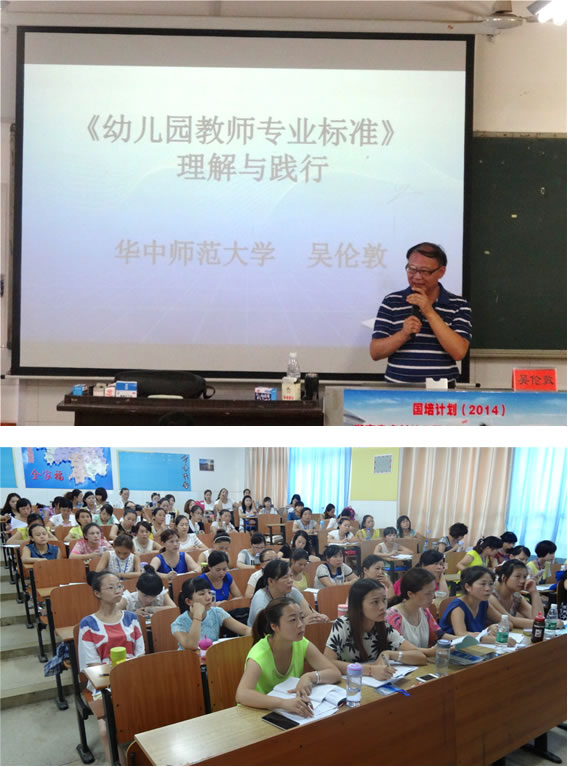 炎炎盛夏,骄阳似火。8月5日下午,华中师范大学吴伦敦教授在文b103为我校“国培计划(2014)”幼教国培班学员做了一场别开生面的“《幼儿园教师专业标准》解读”专题讲座。本次讲座由我校幼教国培首席专家万湘桂主持,全体70名学员和学院管理团队参加。