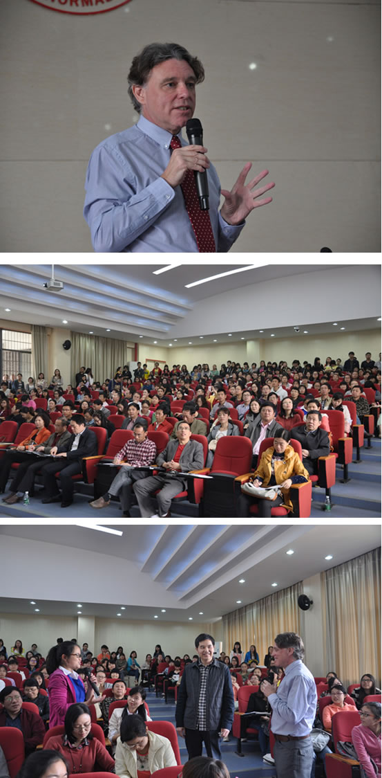 第二场讲座中,mark教授剖析了被动学习与主动学习,介绍了为学而教的教学方式,探讨了有效的课堂教学策略,并通过案例呈现了有效的阅读与写作课堂教学的设计与组织。讲座中,他反复强调了有效课堂教学组织的三个关键词:积极(activeness)、创新(creativeness)、有效(effectiveness)。