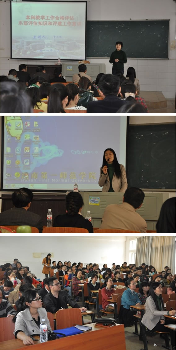 2014年4月1日在东方红校区文b201,教育科学系举行“本科教学工作合格评估工作宣讲暨课程教学改革经验交流会”。会议由系主任蒋蓉教授主持,副校长、校评建工作领导小组常务副组长童小娇教授到会做专题报告,教务处评估中心李婷、系部党政班子成员及全体教职工参加了会议。