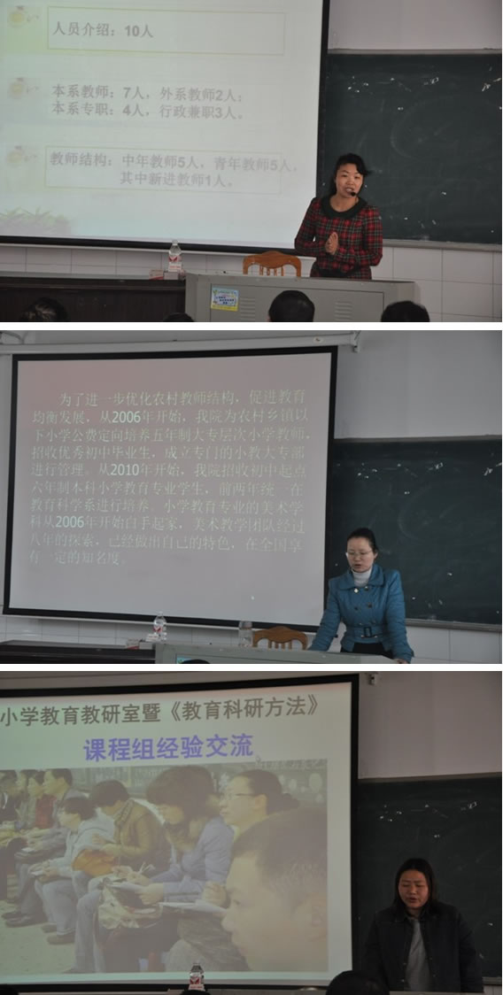 宣讲会后,蒋蓉主任主持召开了课程教学改革经验交流活动。教科系为切实加强课程建设,提升教学水平,积极推进课程组的建设,各课程组定期围绕课程体系、课堂教学、教书育人等问题进行研讨,积累了许多形之有效的经验。在本次交流会上,教师口语课程组负责人李晖旭、小学实用美术课程组负责人张容舟、教育科学研究方法课程组负责人曾晓洁分别就各自课程组在教材建设、课程内容体系改革、教学手段改革、评价方式创新、课内课外沟通衔接、学生技能训练、青年教师培养等多方面的经验做法及取得的成绩。现场气氛热烈,老师们纷纷表示深受启发,今后在教学中也会借鉴这些成功经验。