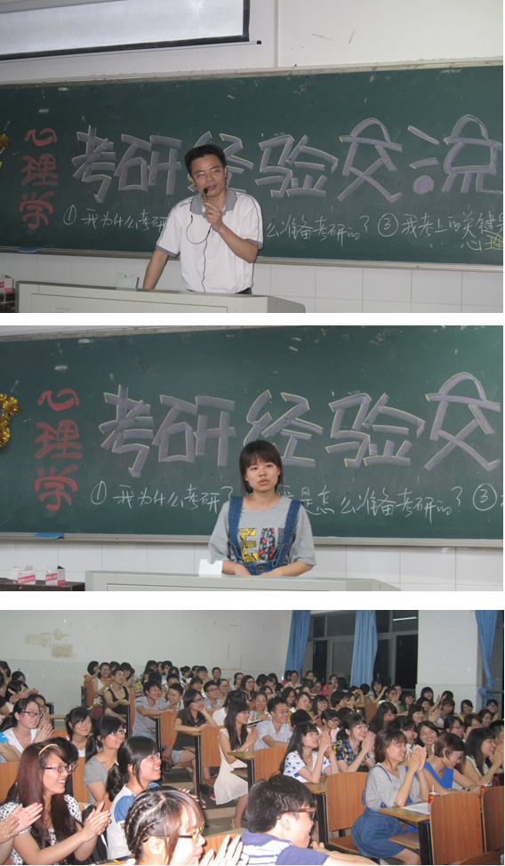 交流会由心理学教研室副主任陈欢老师主持。首先由09级考研成功的学生结合自身考研的经历,分享经验和感受。09级心理学专业共有11名学生考上了华南师范大学等高校,出席此次交流会的是其中一部分学生,他们从“为什么考研”、“我是怎样准备考研的”和“我考研成功的关键是什么”这三个问题回答了肄业班学生在考研准备过程中的一些问题。现身说法,给予准备考研的学生相关信息和支持。