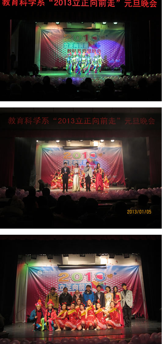 为迎接新的一年,激发同学们积极向上的热情,营造师生和谐氛围,2013年1月5日晚,教育科学系东方红校区“2013立正向前走”元旦晚会在科技楼演播厅隆重举行。教育科学系蒋蓉主任,张尚晏书记,王建平副主任、张平柯副主任、谭玉兰副书记、蔡海军副书记,专职辅导员和部分老师应邀出席并观看本次晚会。