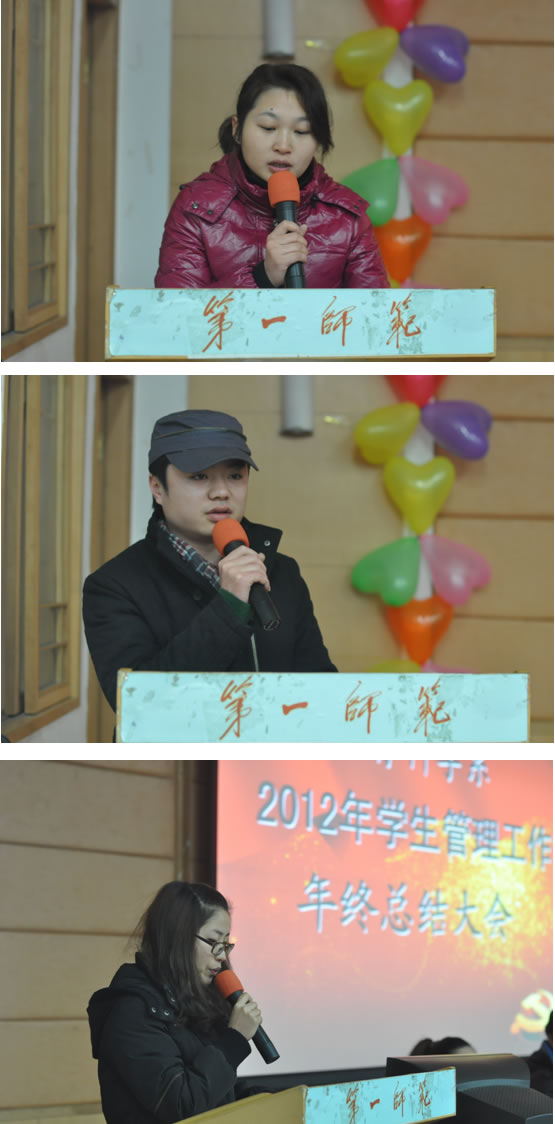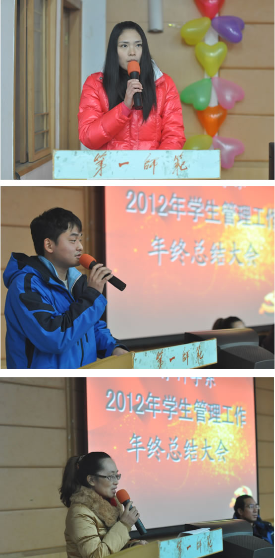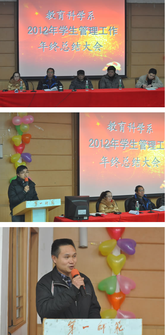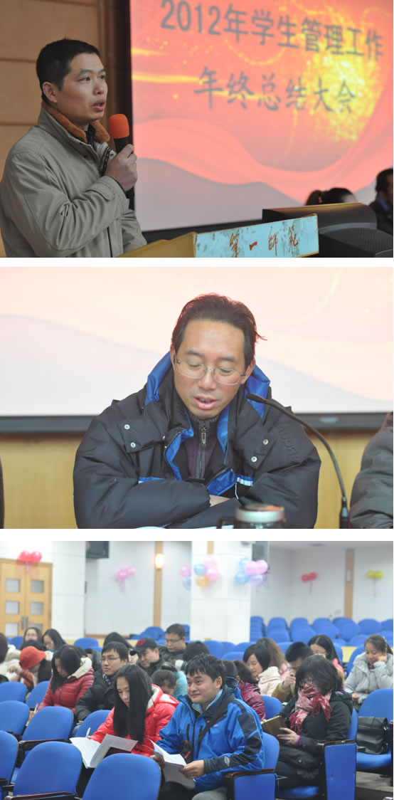 12月28日下午,我系2012年度学生管理工作总结大会在城南校区多功能报告厅隆重举行,学生处丁立平副处长、保卫处陈敬德副处长,系党总支张尚晏书记、谭玉兰副书记、蔡海军副书记出席大会,教育科学系全体专兼职辅导员参加了会议。