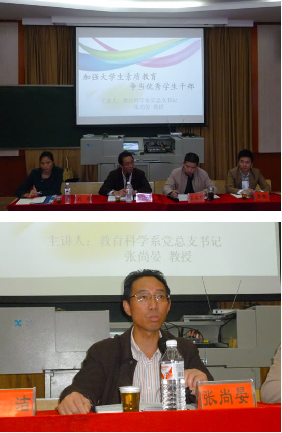 10月29中午,张尚晏书记作了题为《加强大学生素质教育,争当优秀学生干部》的报告,他从学生干部选拔的原则、学习对于学生干部的重要性、担任学生干部的必要性、怎样担任学生干部以及自己竞聘干部的经历与参培学生干部们进行了深入地交流。张书记精辟的观点体现了他丰富的学生工作管理经验以及对学生干部队伍建设的重视,精彩的报告赢得了在场同学们的阵阵掌声。