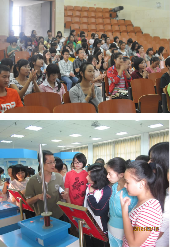 9月16日,东方红校区举办了一场主题为“科学传承与科学创新”的科普学术报告会。国防科技大学博士生导师、美国《格物》杂志副主编、我国相对论研究专家谭暑生教授应邀主讲。我系副主任张平柯、副书记蔡海军、科学教育专业的部分教师以及科学教育专业的同学们一起聆听了报告。谭教授用诙谐幽默的语言深入浅出地为大家诠释了科学传承与科学创新的内涵,讲座现场不时响起热烈掌声。当天,物理演示室、科技制作室、生物标本室等科学教育专业科普基地的主要场馆都面向师生开放,师生们兴趣盎然地参观了展览,参与了互动体验活动。