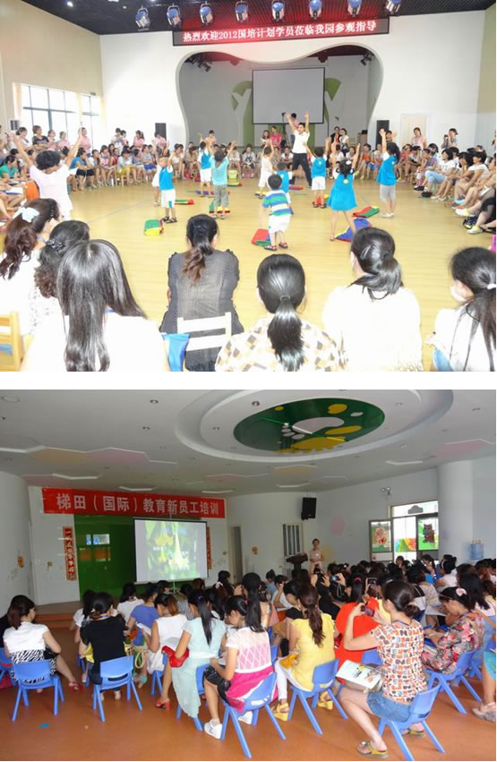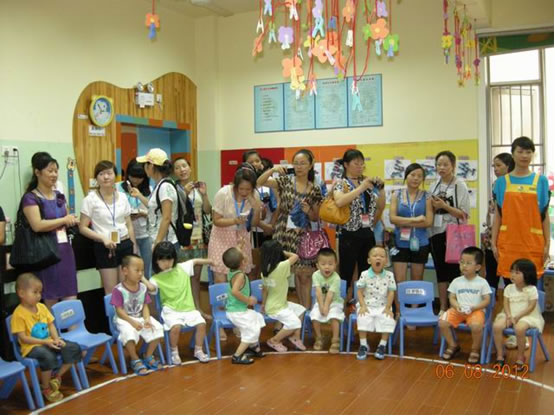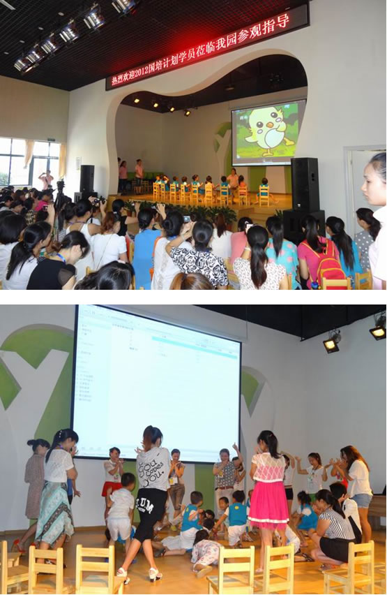 8月6日上午,我系“国培计划(2012)”伟德国际1949农村幼儿园教师培训班 160名学员在学院专家的带领下,来到长沙市明德麓谷幼儿园进行教学观摩。学员们认真观摩了谭娜、吕奕、邹勇三位幼儿园老师分别上的《小小鸡蛋把门开》、《毛毛虫与蝴蝶》、《袋鼠宝宝》语言、音乐、体育活动课。三位授课老师采用生活化、游戏化的教学方法,在孩子们快乐而投入的学习与游戏中,学员们也情不自禁的走进他们,和他们一起做游戏。观摩课结束后,专家与学员们分小组进行了品课活动。