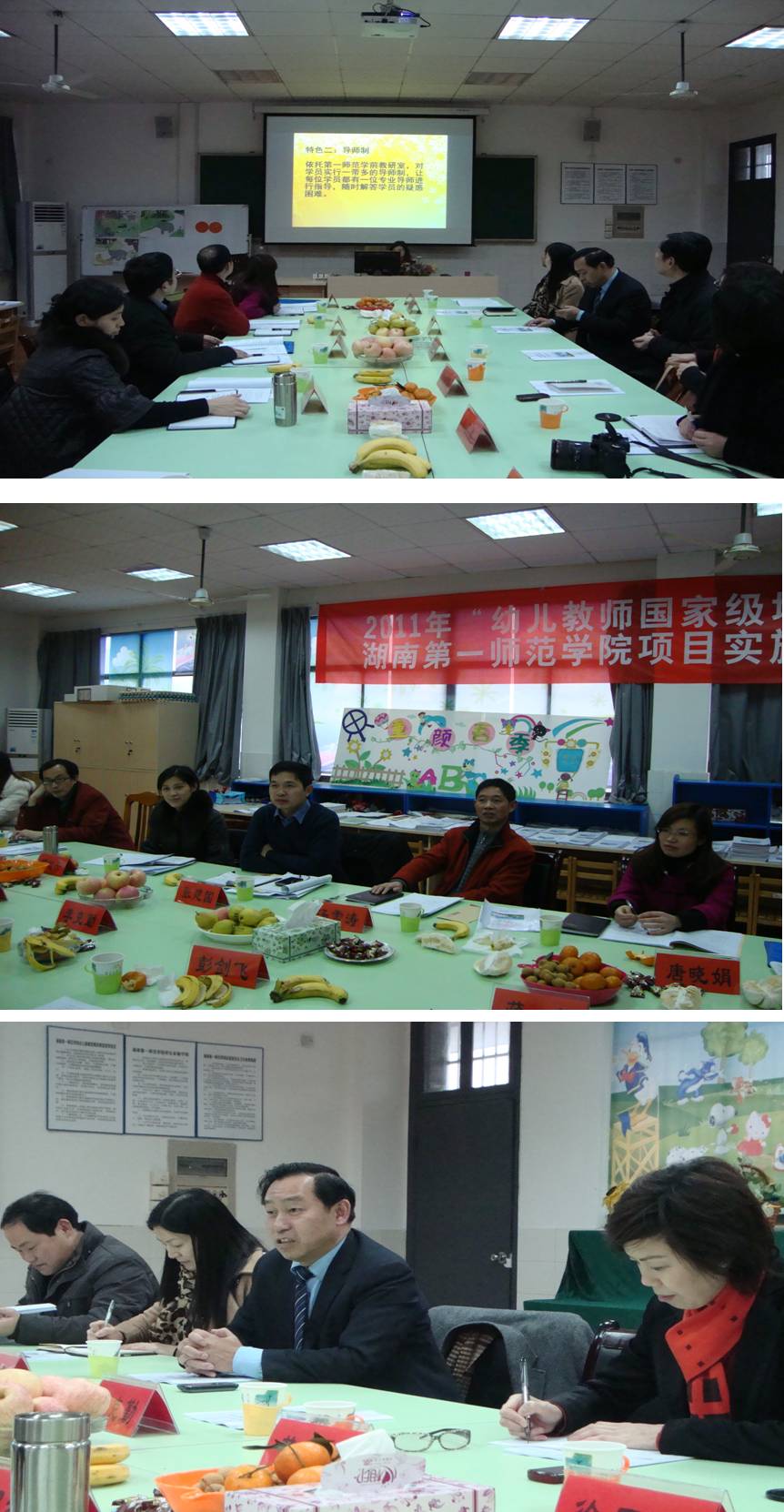 3月22日上午,湖南省国培办专家组张建国、汤雪涛、邓益云、唐晓娟一行四人来我系检查“国培计划(2011)”农村幼儿园教师短期集中培训工作。我院李克勤副院长、国培办主任彭剑飞教授、副主任黄朝霞副研究员、教科系主任蒋蓉教授、副主任王建平博士、学前教研室主任万湘桂副教授等在幼儿园微型模拟教室热情接待了专家组。