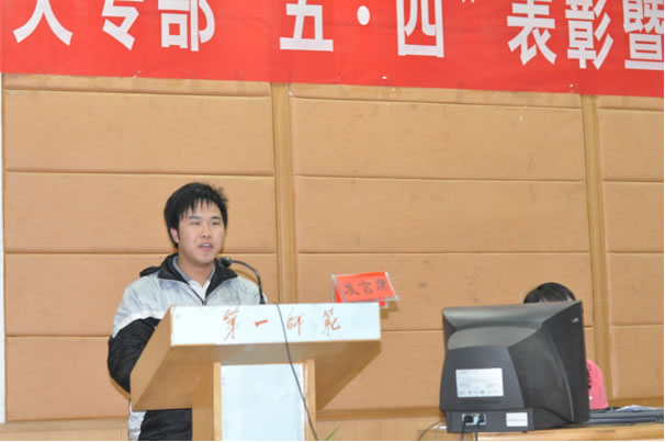 庄严的《国歌》拉开了大会的序幕。会上,蒋蓉主任发表致辞。在充分回顾“五•四运动”后国家九十二年间的巨大变化之后,蒋主任寄语同学们一要高举爱国主义旗帜,坚定理想信念;二要努力提高素质,争当发展先锋;三要加强组织建设,提高能力水平。
