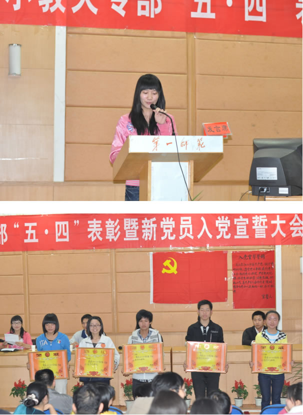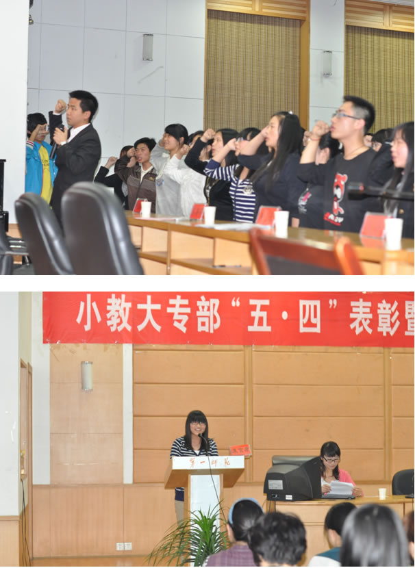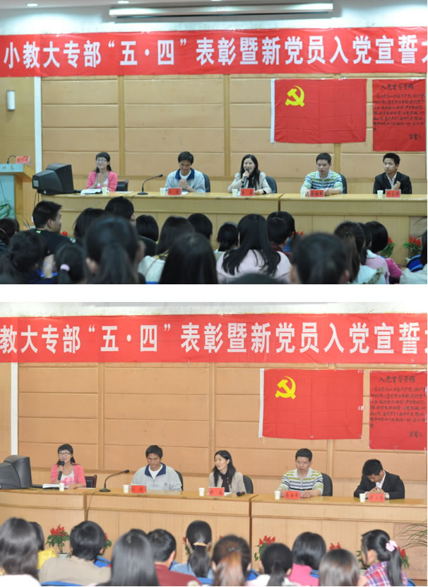 2011年5月24日19:00,小教大专部“五四”表彰暨新党员入党宣誓大会在学院城南校区多功能报告厅举行。小教大专部主任蒋蓉教授,系部党总支蔡海军副书记,系部学工办主任孙侠,系部学生党支部书记邓立群担任嘉宾,出席大会的还有系部党政办主任张俭明,教科办主任郑果,大文党支部书记易文颖,大理党支部书记陈莉及全体专兼职辅导员等。会议由年级辅导员袁耀宗主持。