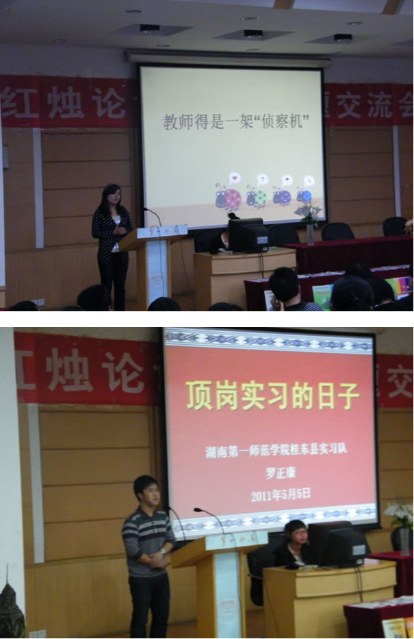 交流会中,06级优秀实习生代表520班彭立玉、525班吴代霞、522班张琨鹏、527班唐小雨、523班李佐娅、526班罗正康、524班汤雅雯等7名同学分别做了《基础教育,从“字”做起》、《让每朵花都能绚丽绽放》、《心路旅程》、《花开的声音》、《爱的收获》、《顶岗实习的日子》、《演绎美丽的教师人生》等主题发言。在发言中,他们精彩地讲述了自己在顶岗实习生活中的真实感触和丰富收获,提到了城乡教育的差距以及农村基层教育事业的任重道远,表达了对农村基础教育的赤子之心和热爱之情。