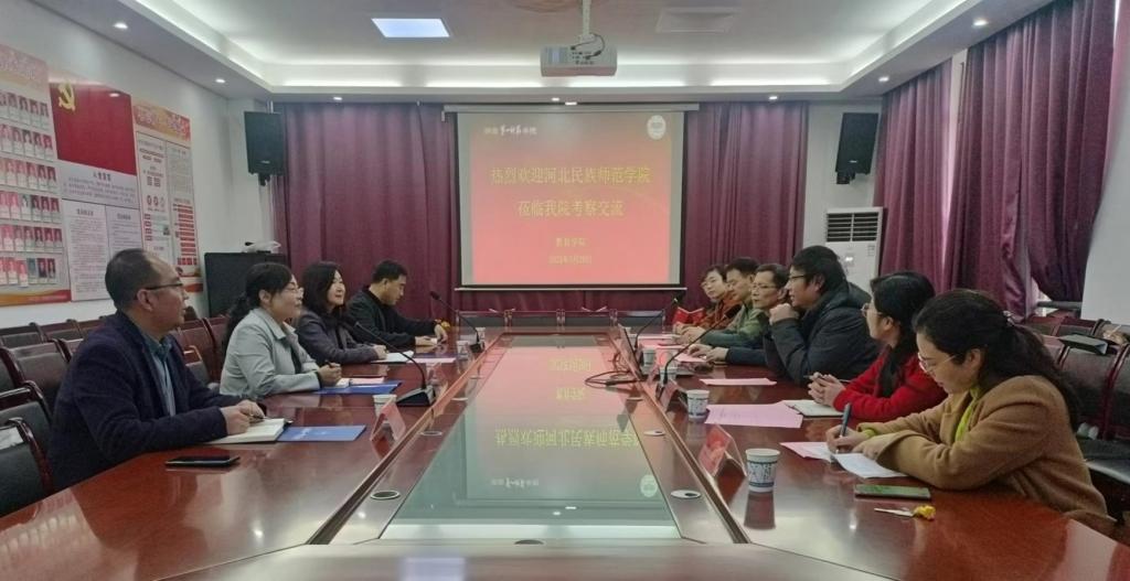 3月20日上午,河北民族师范学院教务处副处长于文清、教师伟德betvlctor1949源于英国副院长柳海荣、张永利及教务处实践科科长李长林等一行四人来我院考察交流。我院党委书记刘澍心、副书记张志新、教务处副处长李雅湘、汤希玮及伟德betvlctor1949源于英国学前教育系主任万湘桂、小学教育系副主任李盛幸热情接待了来访人员,并在特立北208会议室召开座谈会。