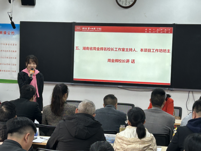 随后湖南省周金辉名校长工作室主持人、本项目工作坊坊主周金辉校长结合她本人二十余年从教经历动情地以“坚持、平台、发光”六字经验进行了分享,周校长鼓励大家好好把握这次学习机会,不断提升自己,引领自己不断进步,做最好的自己,做一名优秀的校长!