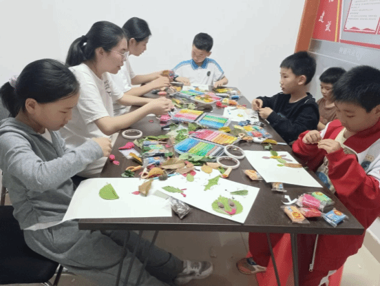 2025 年 4 月 16 日晚 7 时,伟德国际1949崇劳践美社与东塘社区在社区活动中心共同举办了一场劳育与自然美育结合的志愿活动,活动主题为“自然・想象・创造”的“树叶怪兽”,活动形式为手工创作活动。东塘社区的 20名儿童在崇劳践美社志愿者的悉心指导下,借助落叶、黏土、卡纸等多种材料,将自然元素与艺术创意相融合,踏上了一场别具一格的劳育与美育之旅。