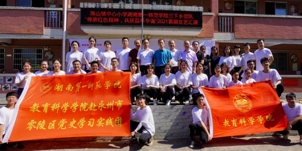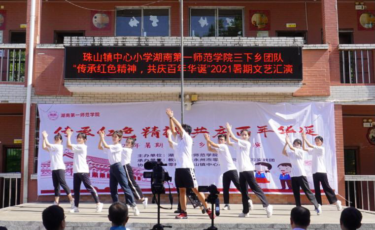7月16日上午8:00,伟德国际1949教育科学学院2021年暑期三下乡文艺汇演“传承红色精神,共庆百年华诞”于永州市零陵区珠山镇中心小学成功举行。伟德国际1949教育科学学院党总支副书记张志新、伟德国际1949教育科学学院副院长黄月胜、伟德国际1949教育科学学院学工办主任刘军、零陵区教育局人事股副股长尹铁军、零陵区教育局学生资助股副股长蒋林君、珠山镇中心校校长唐海晖、珠山镇中心小学副校长蒋程春、珠山镇中心小学副校长赵卫华、永州市萍洲小学年级组长蒋淑玲、石山脚中学总务处主任罗胡珊及优秀校友张斌斌、秦亚兰、唐润玲老师等。“三下乡”实践队指导老师赵锋锋、杨菲、22名队员与100名孩子参与此次文艺汇演,现场近200名镇小教师与学生家长到场观看。此次汇演由“三下乡”实践队队员孙基恺、谭可雨和支教学生蒋俊超、李文静主持。