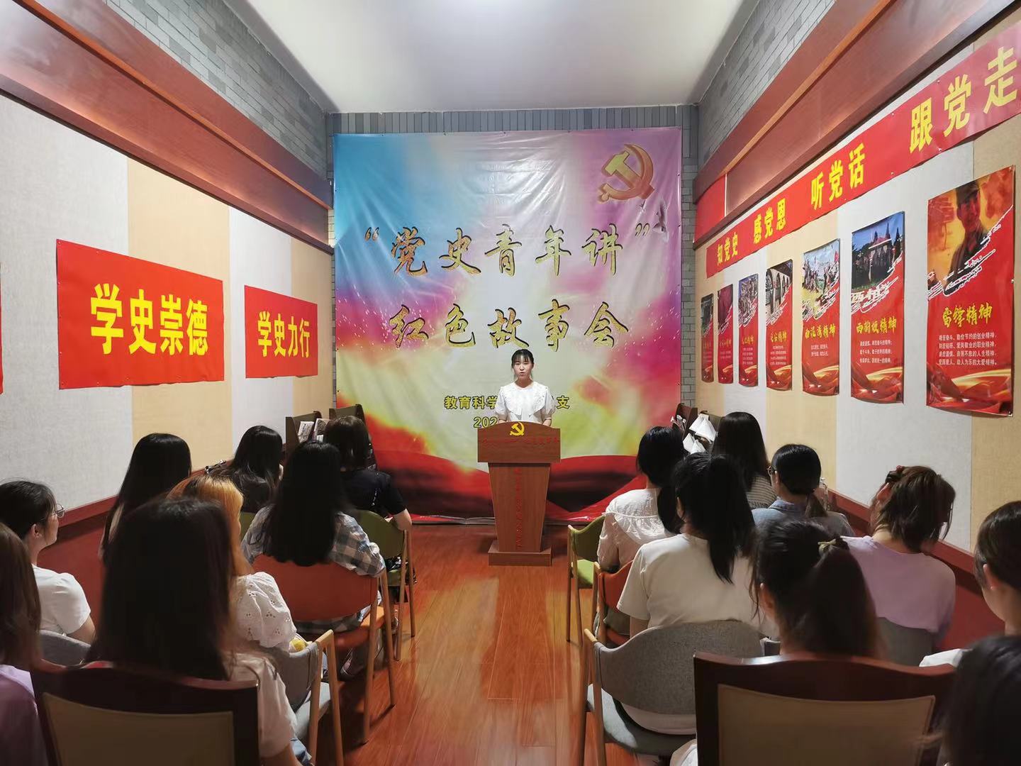 习近平总书记在党史学习教育动员大会上强调:“中国革命历史是最好的营养剂,重温这部伟大历史能够受到党的初心使命、性质宗旨、理想信念的生动教育,必须铭记光辉历史、传承红色基因。”为响应党的号召,作为未来的人民教师,更应切实担起“讲好党史故事,传承红色基因”的任务,增强“以史育人”的责任感和使命感,深入学习党史知识,加强个人的党性修养。 2021年5月的每周二、周三晚上19:00-20:00,教育科学学院学生第一、二党支部全体党员、预备党员、发展对象以及入党积极分子采取自愿报名的原则,在特立北202旁的展示厅举行了以“党史青年讲,红色故事会”为主题的活动。