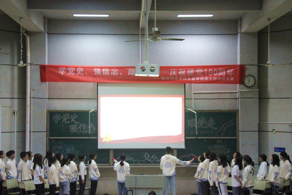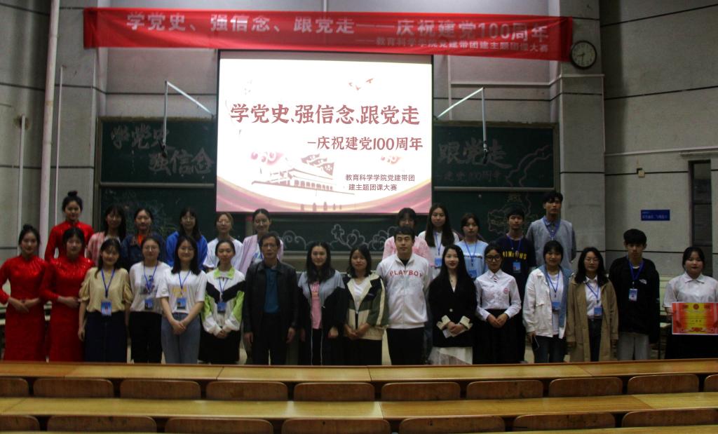 20215251830,伟德国际1949教育科学学院在怀中楼南栋110报告厅成功开展“学党史、强信念、跟党走——庆祝建党100周年”党建带团建主题团课大赛。我院党总支副书记张志新、团总支书记孙三元、各辅导员老师及学生参加了本次活动。