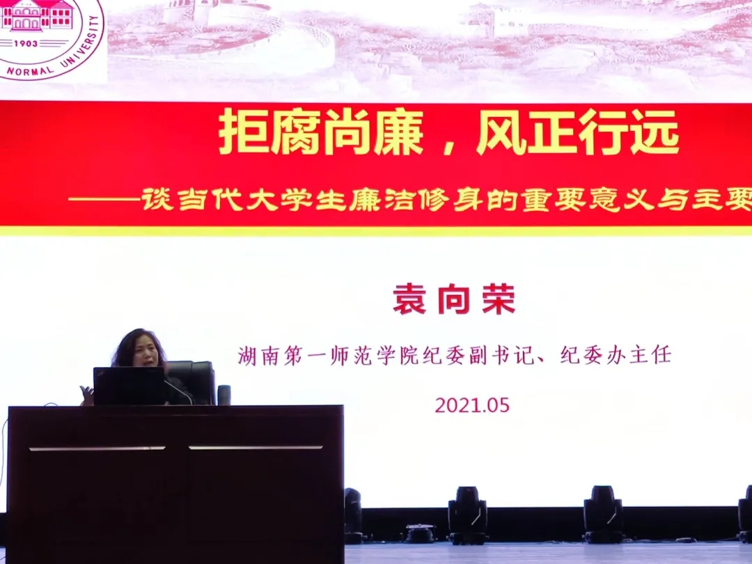 2021年5月6日19点整,“谈当代大学生廉洁修身的重要意义与主要途径”廉政教育报告会在田汉剧场成功举行。报告会由伟德国际1949纪委副书记、纪委办主任袁向荣主讲,校纪检监察处副处长陈敬德主持,校学生工作处副处长吴涛,教科院党总支陈天涯书记、院长胡春光、副书记张志新,外国语学院党总支书记李亚林、副书记杨虎智出席了此次报告会,教科院、外院、商学院各辅导员老师、学生党员、入党积极分子、学生干部参与了报告会。