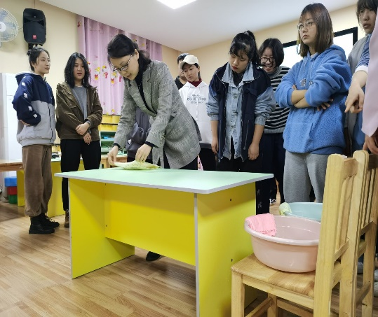 第二天早上9点,保育技能比赛在特立北301教室开始了,邓祎老师、袁小平老、黎玲老师在旁边监督和当评委。20学前1班和20学前2班开始了比赛。2班的同学似乎在拼时间,显得有些急躁,部分操作不规范,被老师叫了重来。1班的帕子很大,同学擦着擦着忘记换面了也被叫了重来。紧随其后比赛的是20国际1班和20国际2班,他们吸取了之前两个班的经验,比赛过程中比前面两个班顺利些,所以时间也短些。比赛结束后,邓祎老师给我们示范了正确规范的步骤,也让我们回家多做做家务。看来同学们在家里都没怎么为家务贡献自己的一份力量。