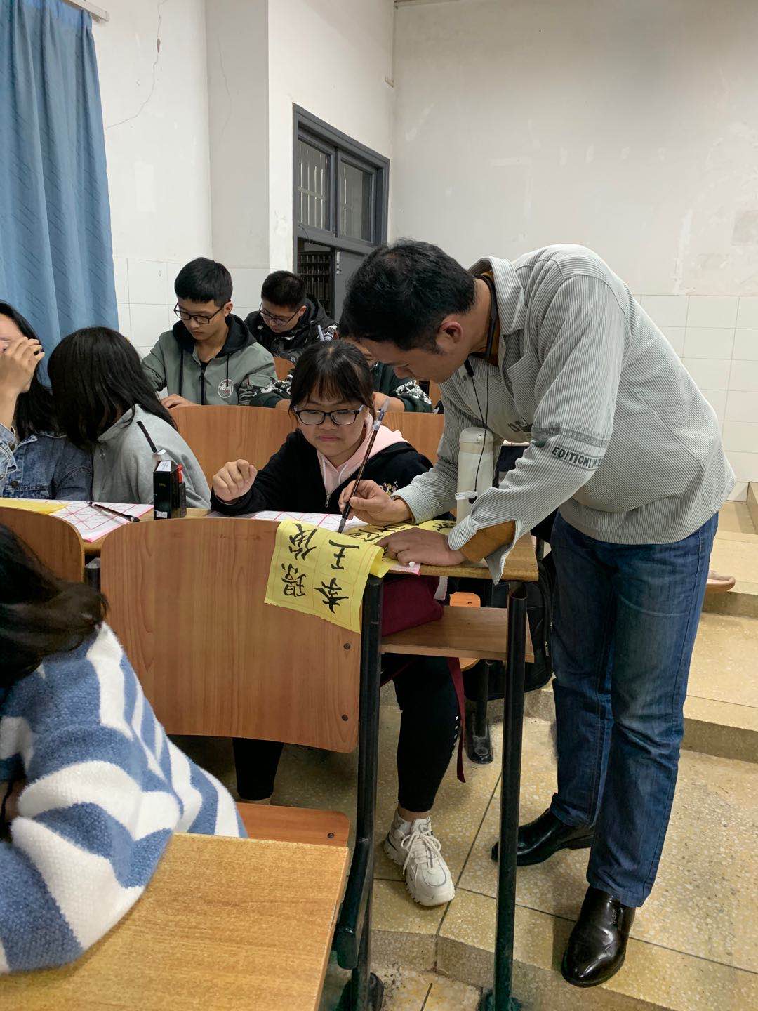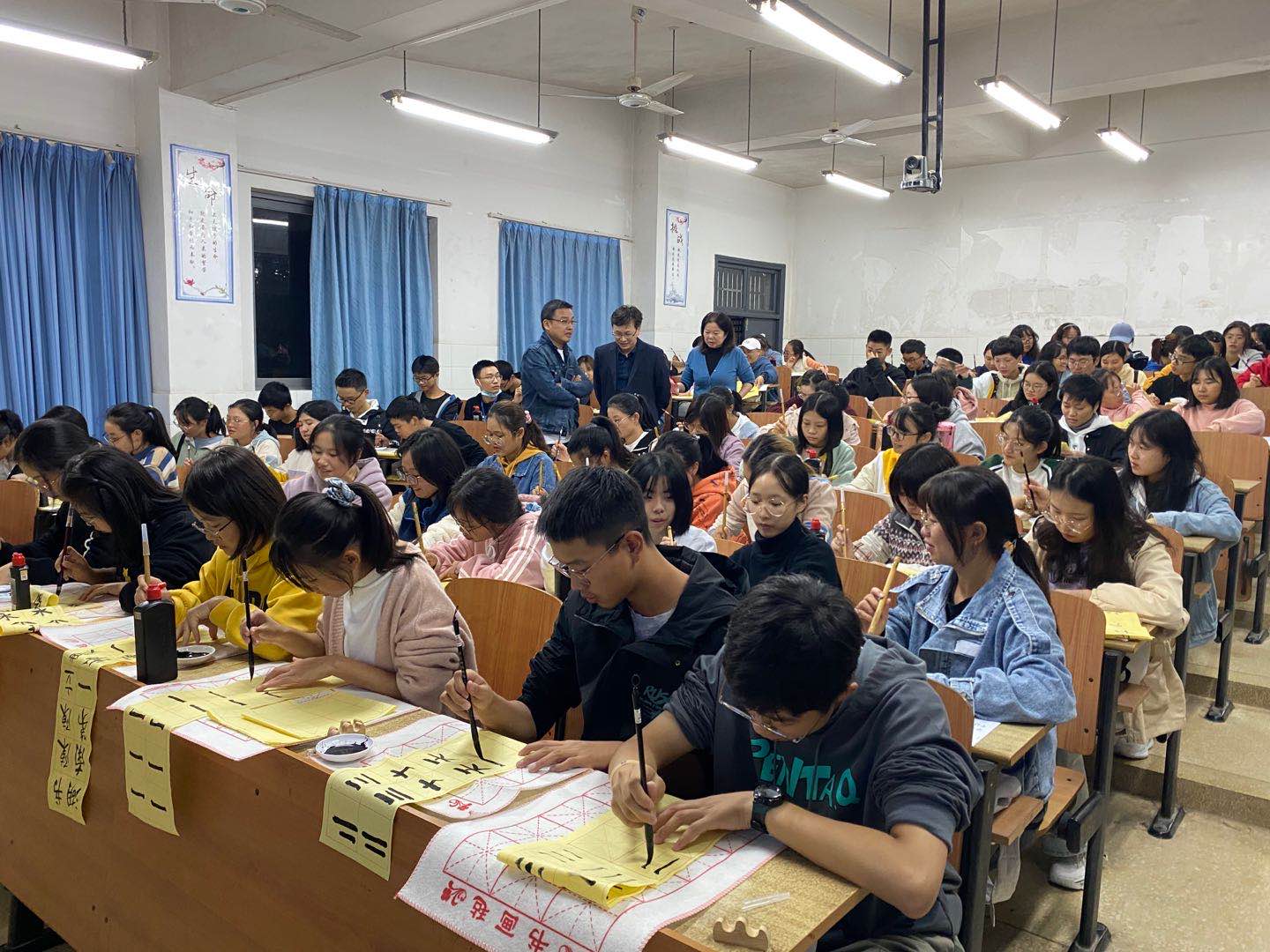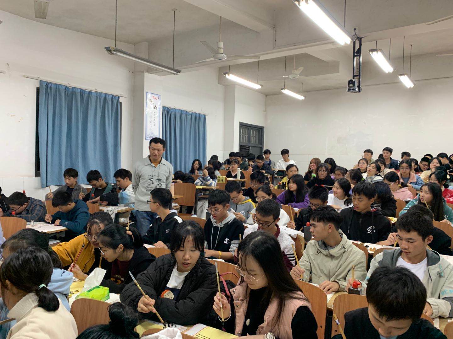 1019日,为全面提升我院2020级学生“三笔一画”师范技能,特邀请了校外书法专家李加林老师为全体2020级新生上了一堂生动的书法课。学院陈天涯书记、胡春光院长、张志新副书记、黄月胜院长助理、刘军老师与全体新生辅导员现场指导同学们的学习。刘森林老师指导我院团学会专业发展部同学,现场建立支撑10个教室共同学习和若干同学通过腾讯会议观看的直播体系。