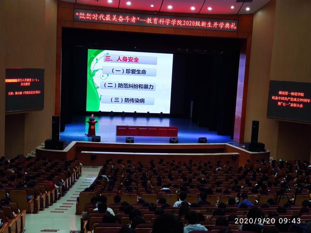 9月20日上午,教育科学学院在田汉剧场举办2020级新生安全教育主题讲座。讲座由教科院党总支书记陈天涯主讲,由教科院党总支副书记张志新主持。